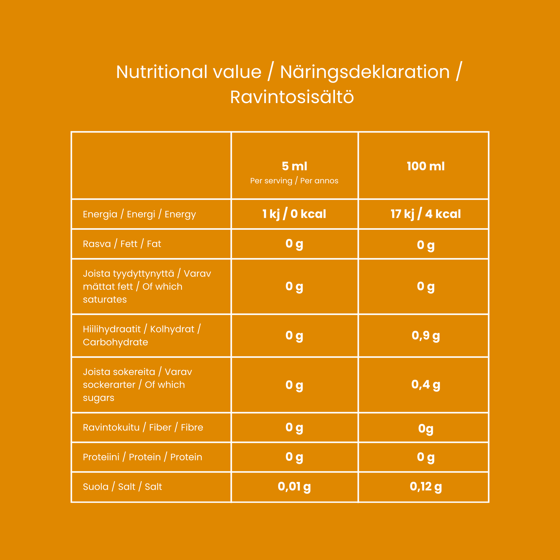 Energiaa: 1kj/0kcal / Rasvaa: 0g / josta tyydyttyneitä: 0g / Hiilihydraatteja: 0g / josta sokereita: 0g / Proteiinia: 0g / Suolaa: 0,01g