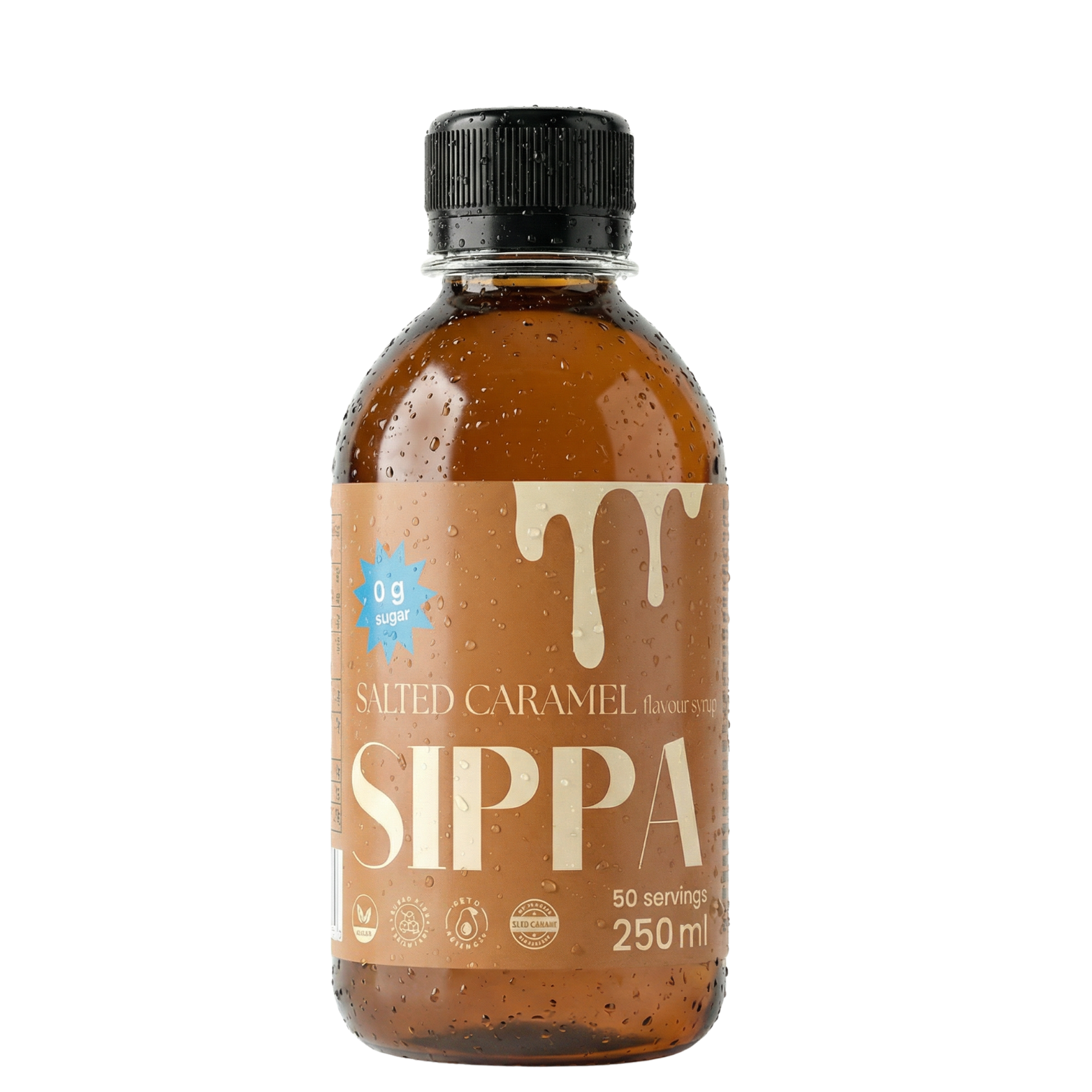 Suolaisen karamellin täyteläisen makeaa balanssia mukaileva SIPPA salted Caramel päivittää kahvit, cocktailit ja muut kulinaariset luomuksesi uudelle tasolle. Heiluta hyvästit turhalle sokerille ja turvotukselle vegaanisen, ketoystävällisen, sokerittoman ja kalorittoman makusiirapin avulla.